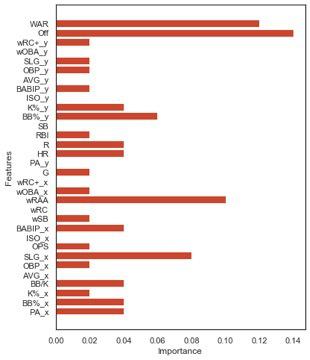 Feature selection empowers our model with an accurate assessment of voters’ bias. The “Feature Importance” technique essentially rates the relevancy of every data feature in the historical context of award recipients. As the bar chart below shows, there are eight hitting statistics that we should absolutely drop from our model—every instance where “importance” equals 0. To further reduce the noise generated by redundancies in the dataset, we might also consider filtering out features that fail to meet a minimum importance score, such as 0.02 or 0.04. This data-cleaning process reveals that the managers and coaches of 2019 likely overlooked the inherent offensive skill captured in the “Weighted Runs Above Average” (wRAA) statistic, a critical feature of historically high importance, as demonstrated by their election of Ronald Acuña (30.3 wRAA) in place of both Ketel Marte (46.1) and Juan Soto (42.2) as a winner for National League Outfielders.