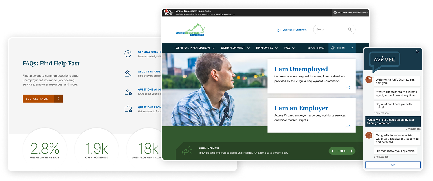 The Virginia Employment Commission (VEC) website is an essential tool for unemployed citizens applying for benefits and for employers complying with unemployment insurance laws. Over time, however, the website had become dated and less efficient.