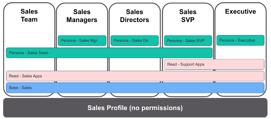 Profiles worked well initially because they took care of everything that a group of users needed. Let's call this group of users a Persona. Everyone within the Persona has the same sort of needs based on what they do in Salesforce. Note, what one does in Salesforce is often unrelated to one’s job title. A Persona like “sales user” helps define the essential levels of access across the system that are needed for sales. A Persona could easily overlap with another, like the Service Persona.